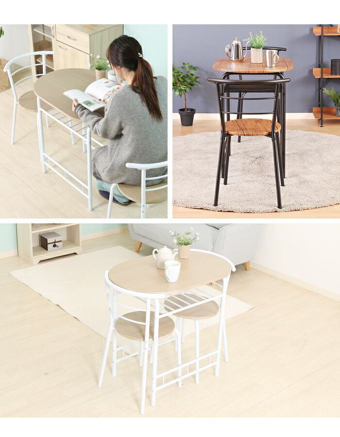 コンパクトで快適に使えるダイニング3点セット。省スペースながらも使い勝手が良く、テーブルとチェア2脚がセットになっています。木目調の天板とスチールフレームの組み合わせで、スタイリッシュかつ温かみのあるデザイン。新生活やワンルーム、カフェ風の空間づくりにもおすすめです。