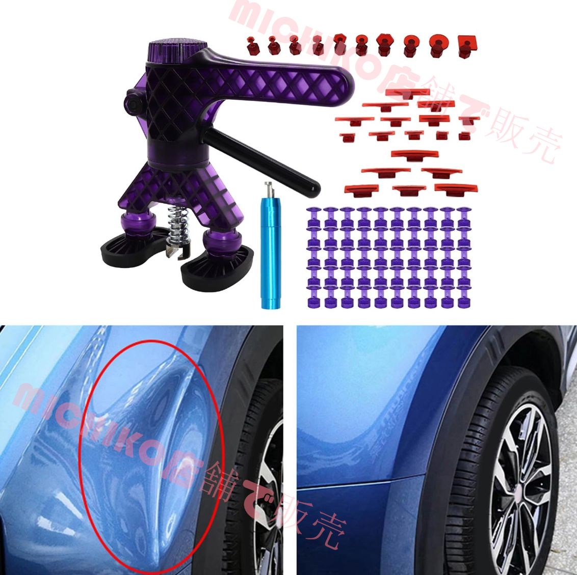 このデントリペアプーラーセットは、高強度の引っ張り力を利用してへこみ部分を徐々に元の位置に引き戻し、迅速かつ効率的な修理プロセスを保証します。従来の方法と比較して時間と労力を節約します。