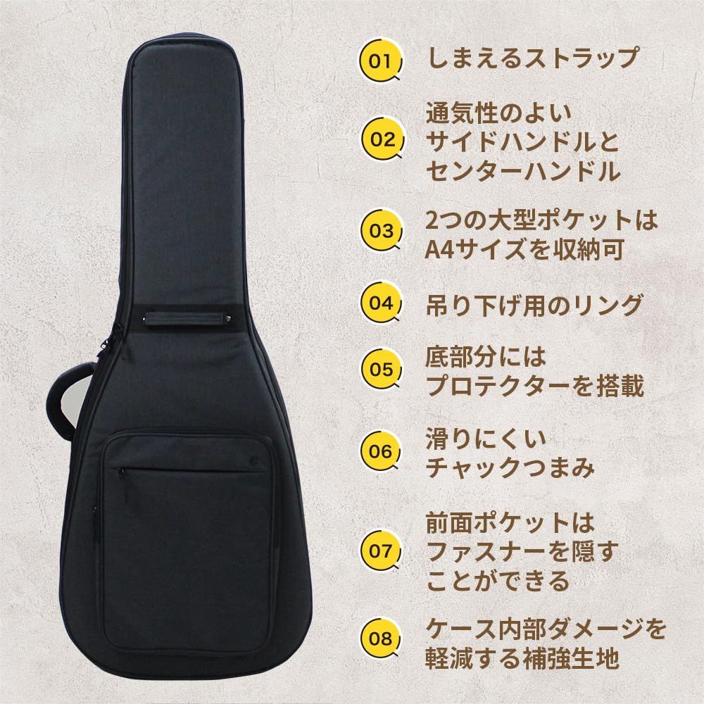 十分なクッションと着脱可能なヘッドレストを装備し、底部分にはプロテクターを搭載し、楽器をしっかり守ります。弦などのケース本体へのダメージを軽減する補強生地をヘッド部とボディ部内装に縫い付け耐久性UP。前面ポケットのチャックは内側縫製により隠すことが可能です。スタイリッシュな見た目と共に不意の引っ掛かりを防ぎます。