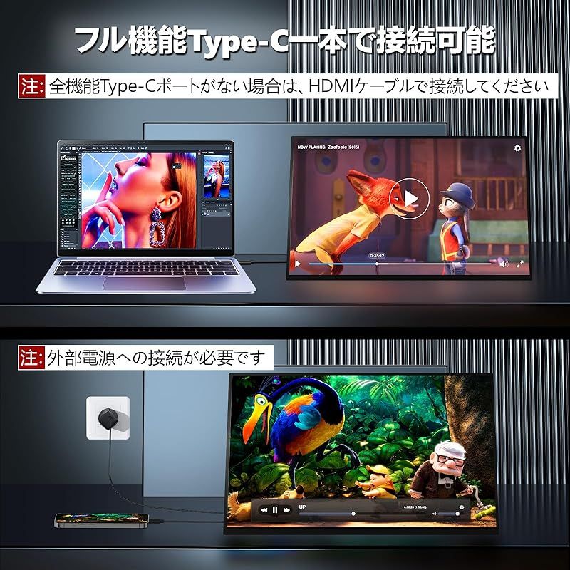 【Type-C一本で接続】このモバイルモニターは2つのフル機能Type-Cポート、一つミニHDMIポートを備えており、電力供給とディスプレイ信号伝送のために1本のUSB Type-Cケーブルのみが必要です。※ご使用のデバイスは、Thunderbolt 3.0またはUSB3.1Type-Cポートに対応している必要があります。ノートパソコン、PC、スマートフォン、MacBook、PS5/PS4、Xbox、Switchなど、多様なデバイスとの接続をサポートします。※HDMIとUSBA接続も可能です。