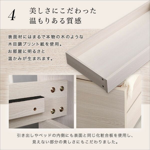 説明大人かわいいチェストベッドSDサイズ!2口コンセントが付いた宮棚はスマホの充電やお気に入りの小物置きにピッタリ!衣類や寝具などをたっぷり収納できる引き出し付きで左右付け替えOK!腰掛けるのに程良い高さなので、立ち上がりがスムーズにでき、日中はソファとしてお使い頂くのもオススメです!本物の木のような木目調プリント紙でお部屋に明るさと温かみが生まれます。
