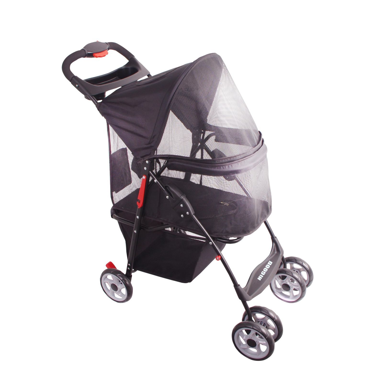 HIGOOD 犬猫用フルウィンドウペットカート4輪タイプ 収納バスケット・カップホルダー付き、子犬や猫とのお出かけに最適
