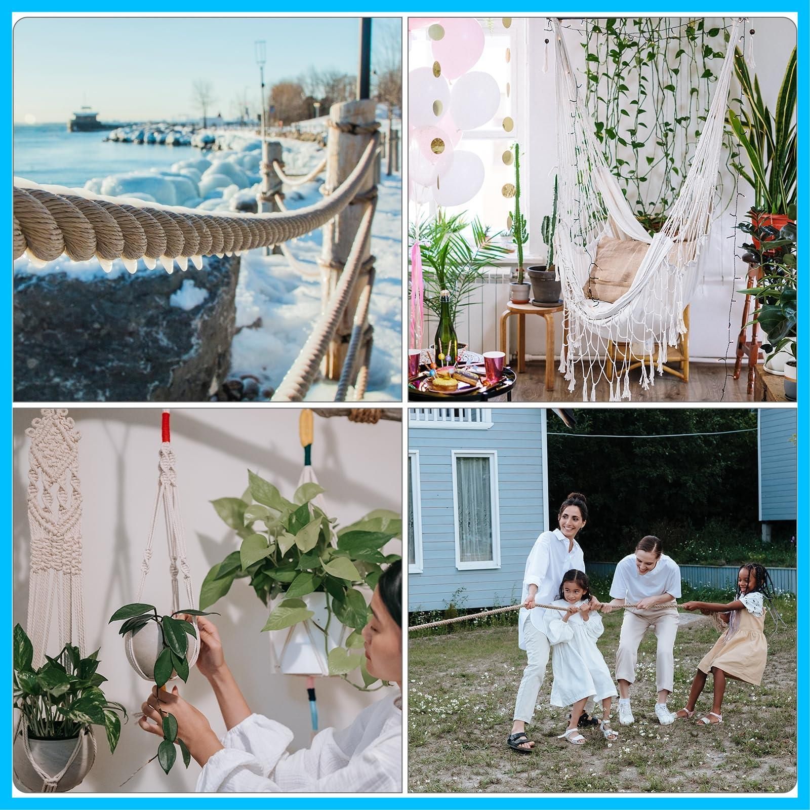 用途:この綿ロープはDIY工芸品の製作、家の装飾、ハンギングバスケットハンモック、ブランコ、壁の装飾、吊り下げ植木鉢、洋服ハンガーの作成、猫の爪とぎポスト、ガーデニング、屋外の綱引き活動などに広く使用できます。