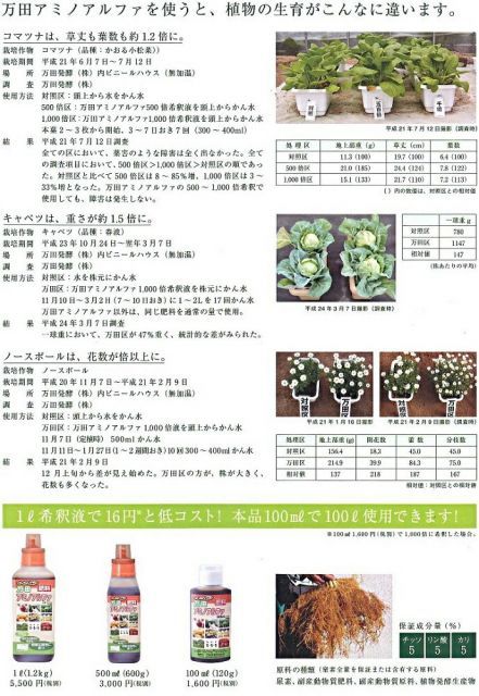 ※万田アミノアルファは一部化成肥料(尿素)を含みますので農産物の有機認証には該当しない資材です。