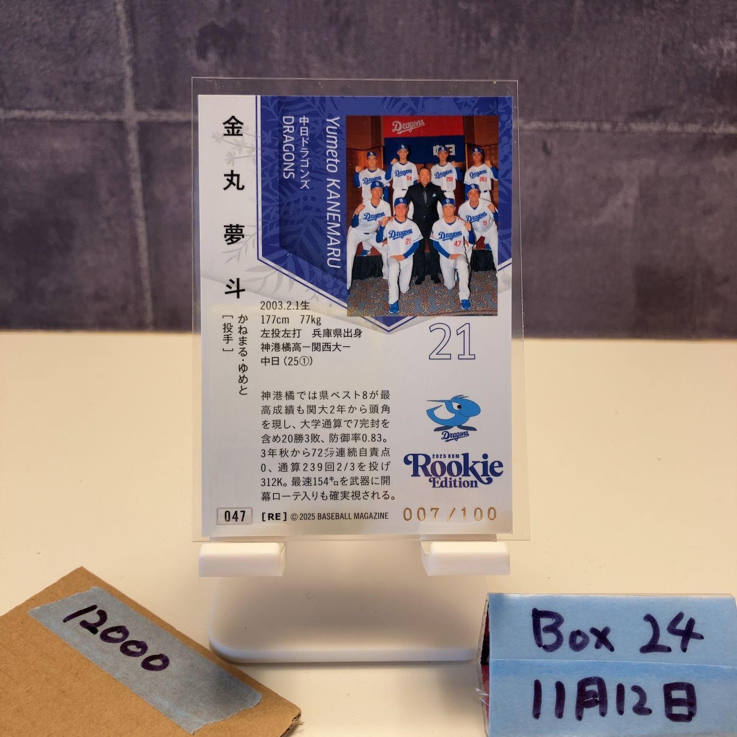 2025 BBM 金丸夢斗 007/100 金箔サイン 中日ドラゴンズ RC ルーキー Rookie