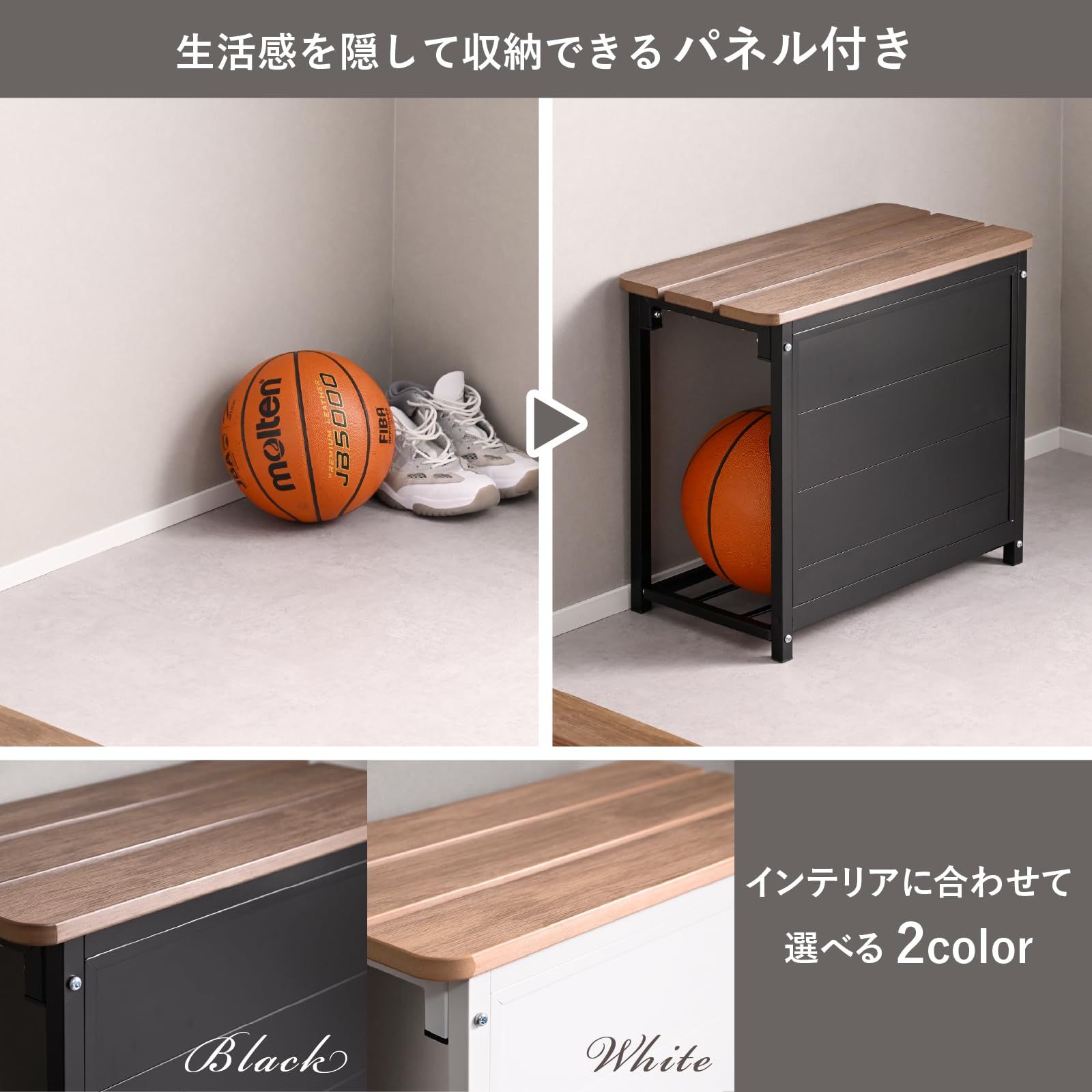 【ラック付き】棚が1段ついているので大人用の靴なら2足程度、収納できます。パネルを前にして設置すれば目隠しになり、生活感を隠しながら靴を収納できます。サイドが開いているので玄関ベンチの向きを変えなくても、横からサッと中のものを取り出せます。
