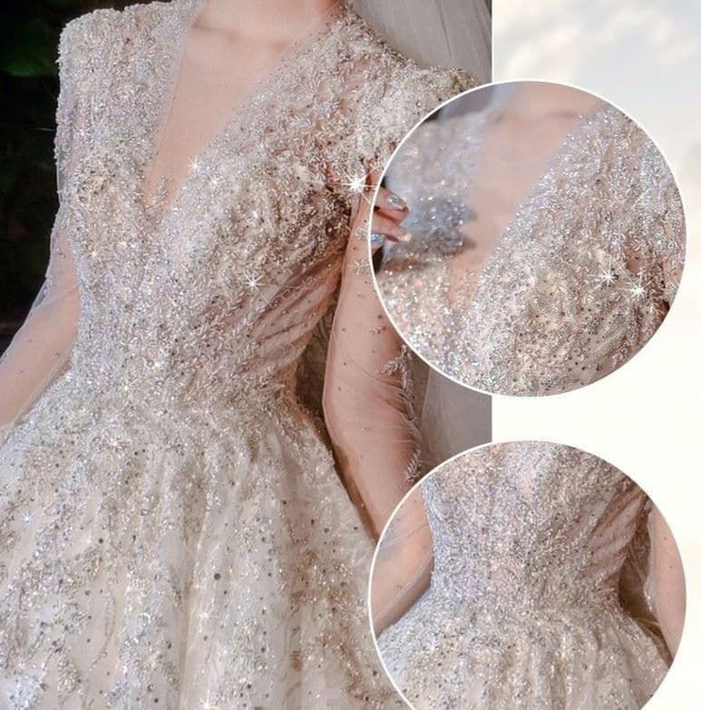 華やかに輝くロングトレーン付きゴージャスウェディングドレス