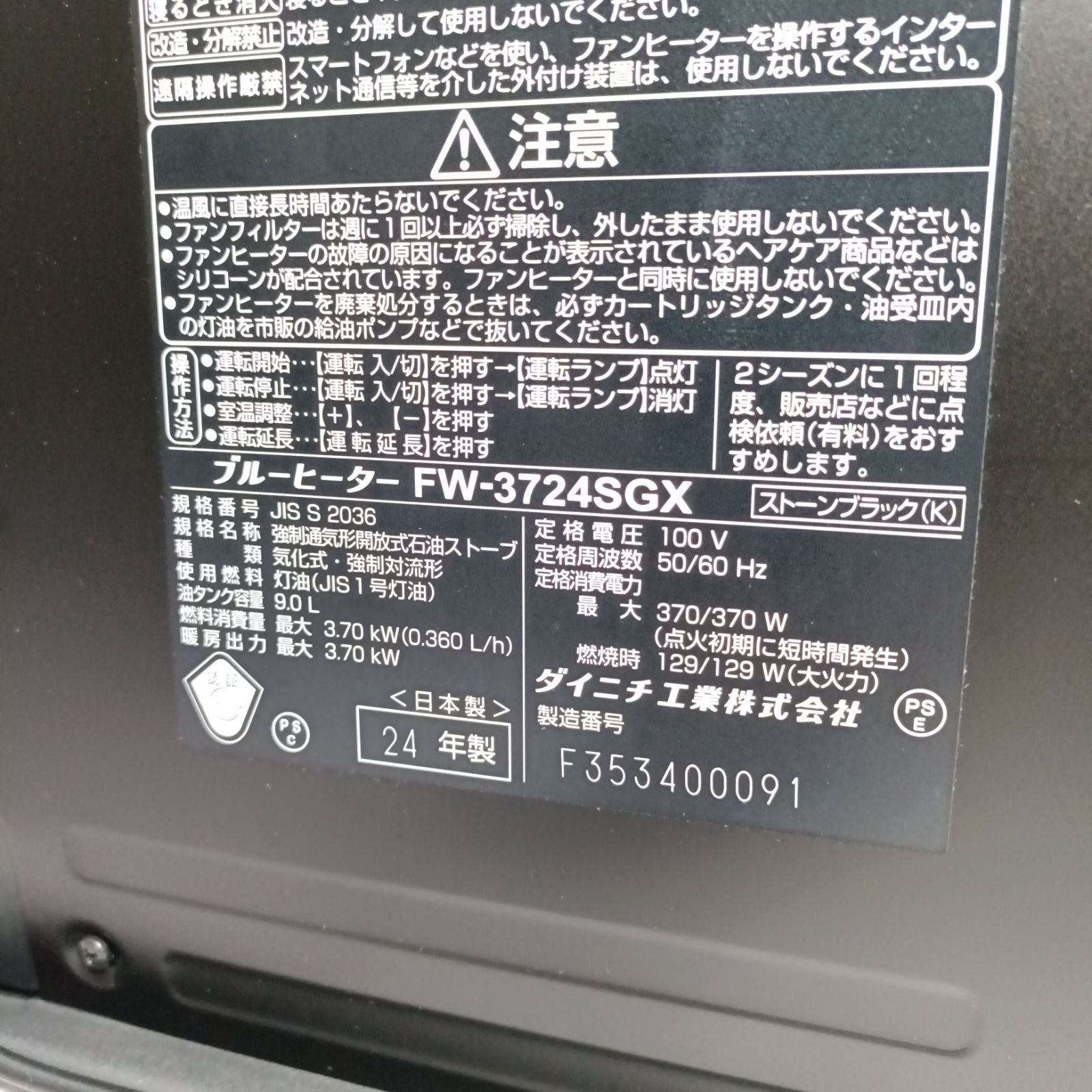 ダイニチ 家庭用石油ファンヒーター SGXタイプ FW-3724SGX-K(ストーンブラック)