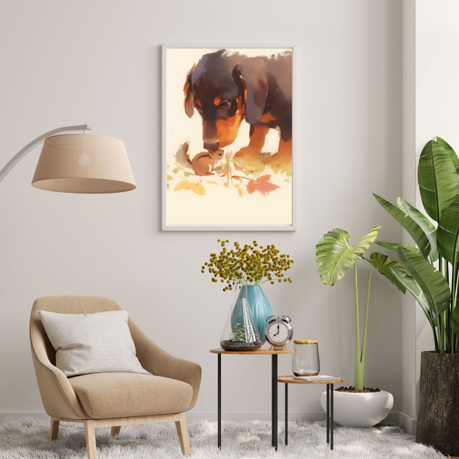 紅葉の秋に栗鼠(リス)と戯れるダックスフンド犬の子犬の姿が可愛すぎるアートポスター作品です。