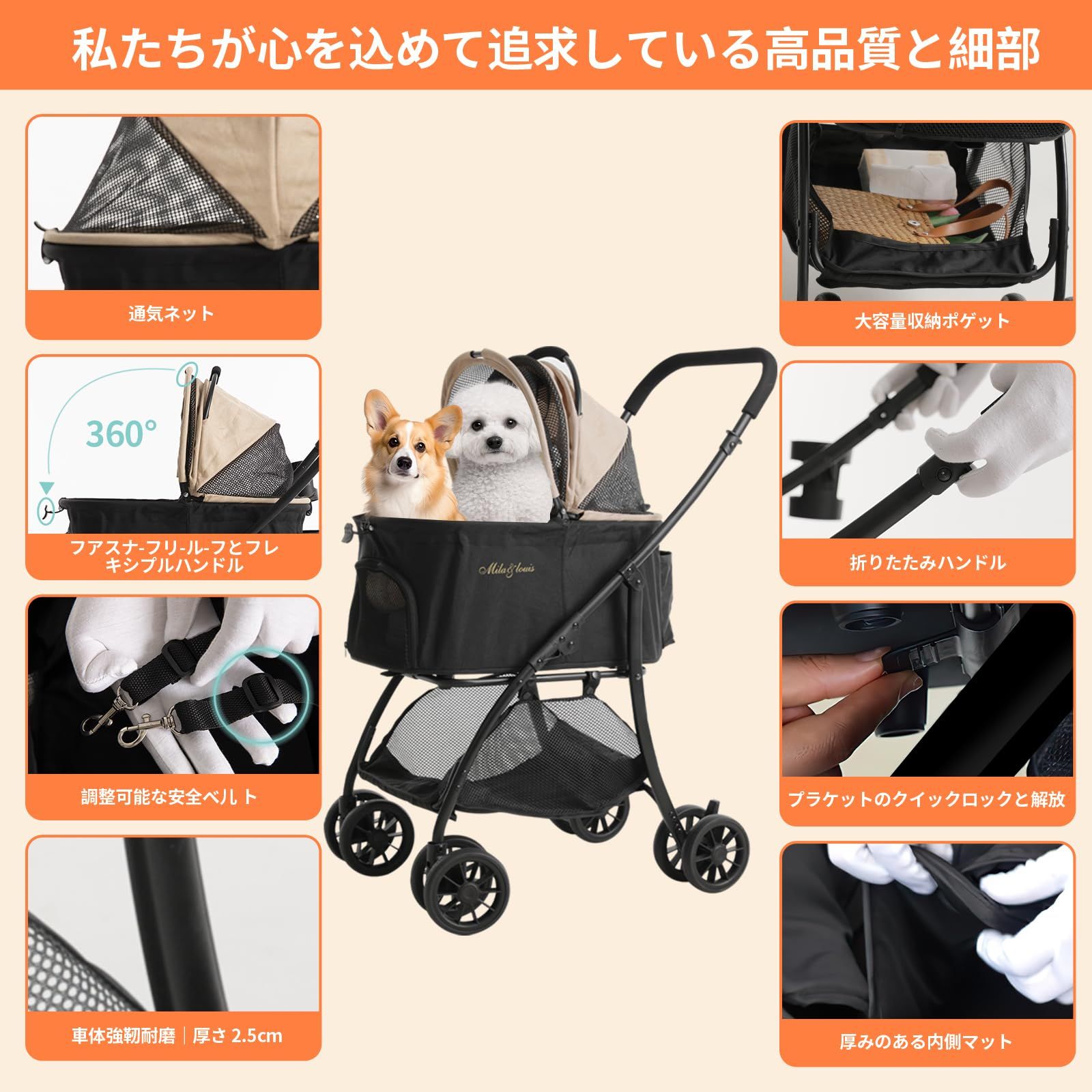MILA&LOUIS ペットカート 4.5KG 超軽量 犬 カート ペットカート 多頭の小型犬&猫 中型犬一匹用 4輪耐摩耗 犬用カート 犬 ベビーカー 人気 分離型・全体と折りたたみ式 ペットバギー 前輪360°後輪ブレーキ付 カップホルダー 犬 バギー 耐荷重20KG 軽量 通気 散歩 買い物 外出 旅行