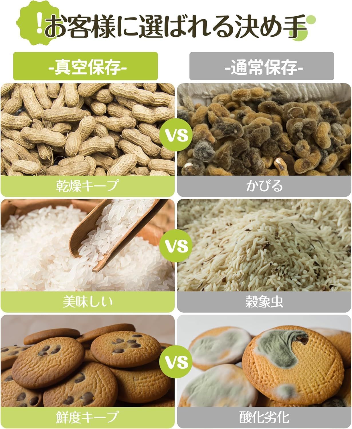 特徴 自動式真空保存、食品の鮮度長持ち、梅雨対策、防虫/湿気/酸化防止、ワンボタン操作、透明な窓付き、40dB低騒音、食品級ABS安心素材採用、無臭、頑丈