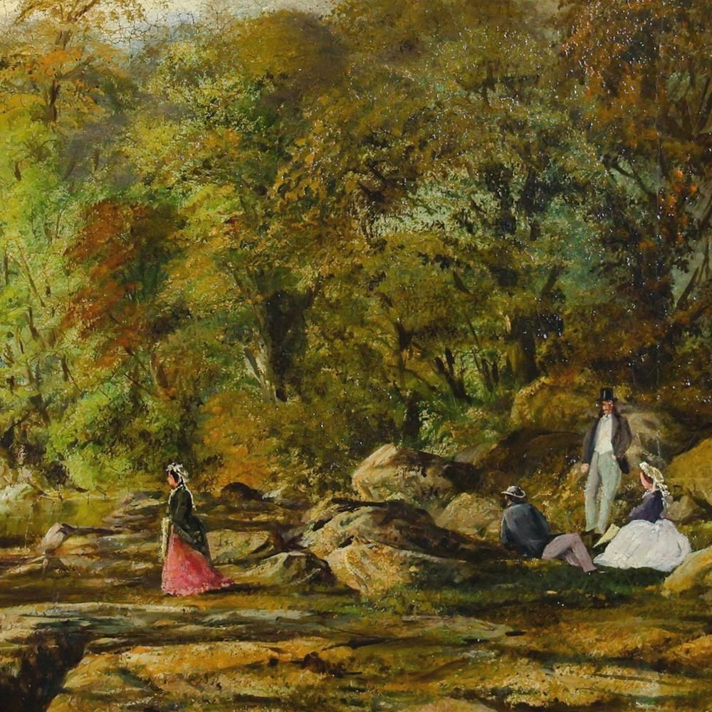 WISH サイン有 I.H.S 油彩 6号大 河風景 古い絵 19世紀頃 滝辺に憩う人々のロマン画