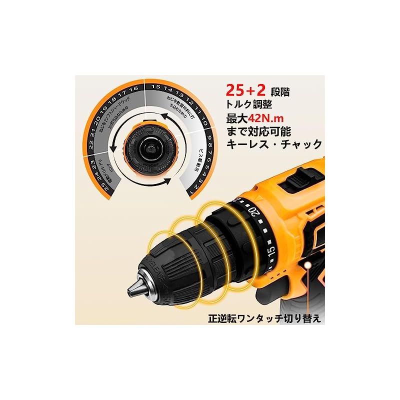 【 25段階トルク調整 & 高/低速の切り替】:クラッチ機能で25段階のトルク調節可能、作業ニーズに合わせて自由に調節できます。 電動ドリルの回転スピードは2段階(0~350RPM/0~1400RPM)が切り替え、トリガーを握る力の強弱で無段階微調整が可能です。スピード調節とトルク調節機能で幅広い材質に傷をつけず、きれいな組み立てができる。