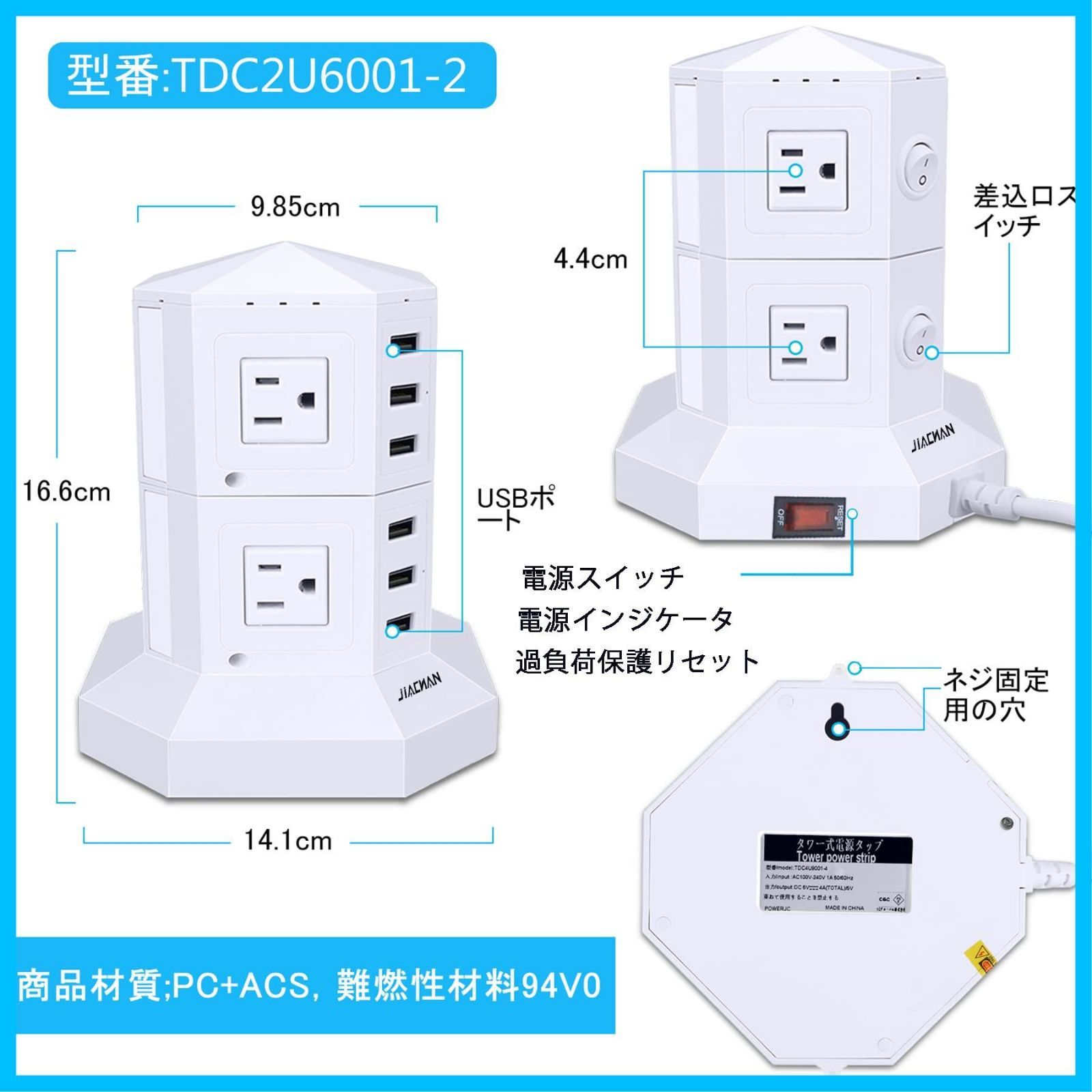 ●【たっぷり!充電口】新型のタワー型デザインのJIACHAN電源タップは8個AC電源口と6つのUSBポートまで持っています。タブレットやスマホ、パソコン、小家電など同時に複数のデバイスに充電する可能です。タワーデザインの場合、電子機器が互いに干渉せずに使用できて、機器のコードは絡んだりすることが発生しませんというメリットもあります。
