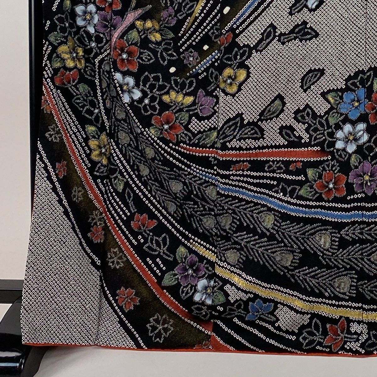 振袖 身丈170.5 cm 裄丈67 M 袷 草花 絞り 金銀彩 黒灰 正絹