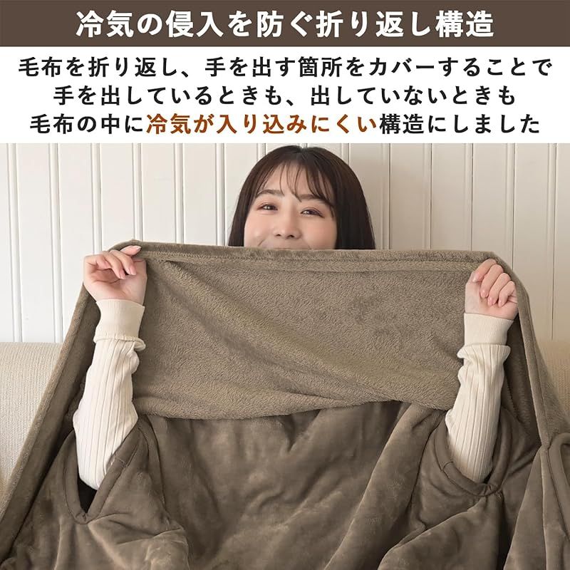 【冷気の侵入を防ぐ折り返し構造】毛布表面を折り返し構造にしたことで、アームホールから冷気が入りにくくなっており、毛布の中はしっかりとあたたまります。