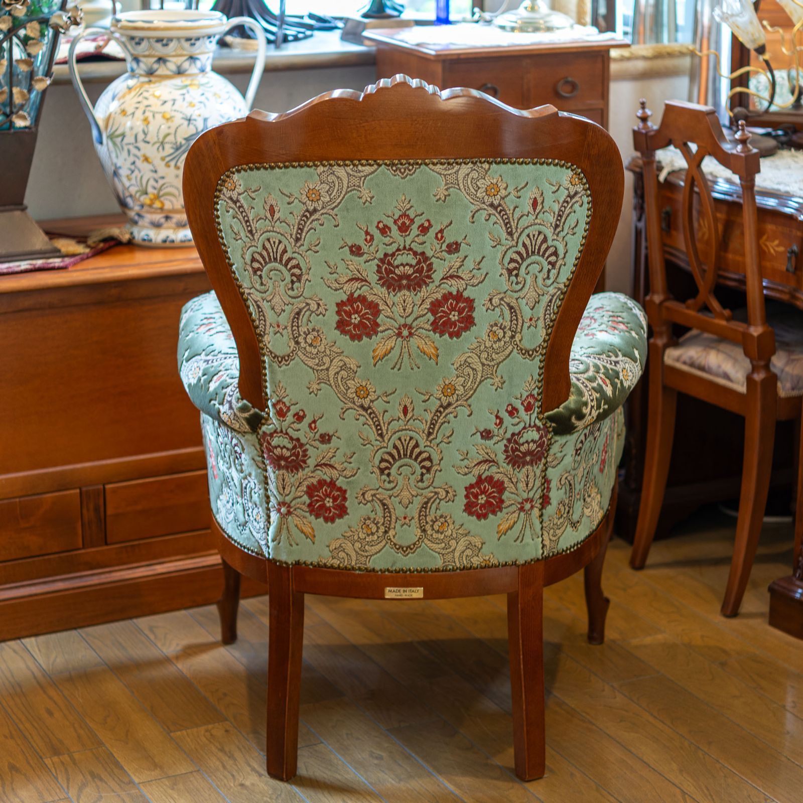 イタリア製の金華山織り生地をふんだんに使用した木製ハイバックアームチェアーは、深みのあるグリーンが特徴で、重厚かつエレガントなデザインが空間に上質な雰囲気をもたらしてくれます。
