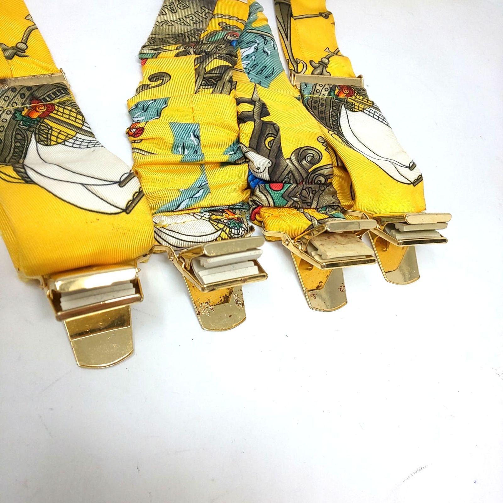 970 B-03 HERMES エルメス シルク サスペンダー レザー 総柄 イエロー系 ゴールド金具 ブランド 服飾雑貨