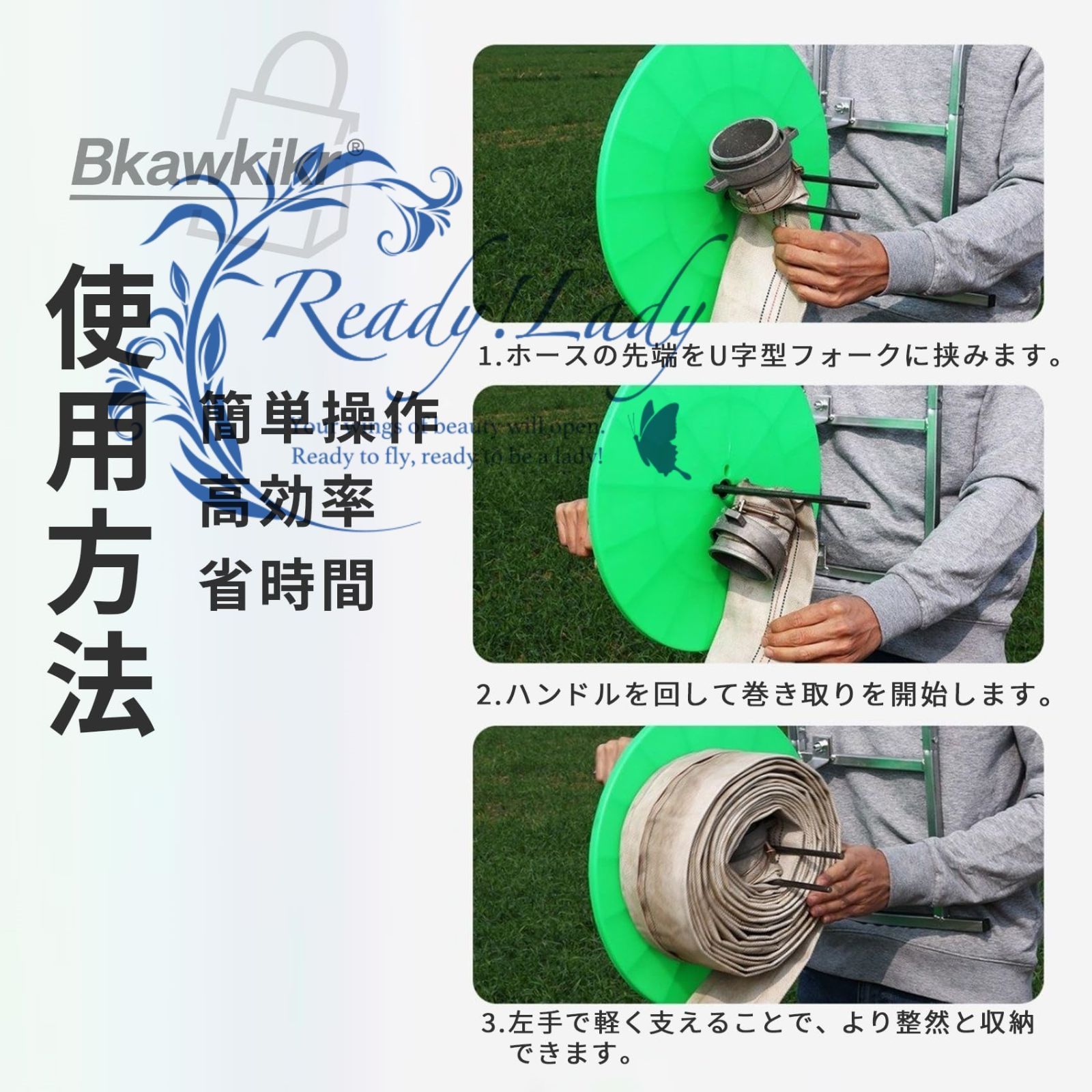 簡単操作:U字型フォークにホースを挟み、ハンドルを回すだけでスムーズに巻き取り。左手で支えればより整然と収納可能。水やりホース、ガーデンホース に便利。