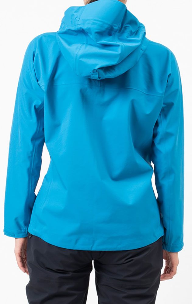 ハーネスに干渉しない高めに位置したジップポケット、両開きフロントジップ、ドローコードで調節可能な裾、袖ベルクロアジャスター