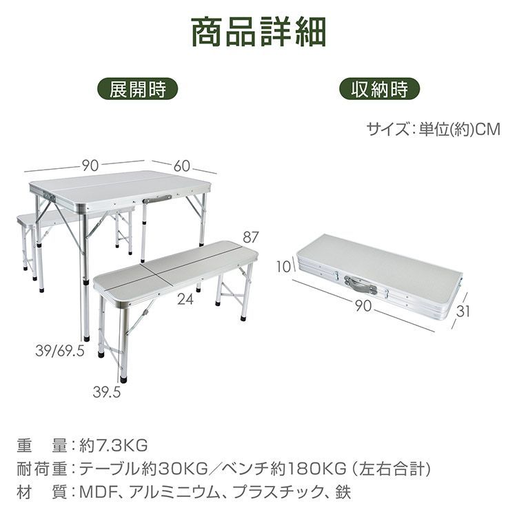 【耐荷重(約)】:テーブル30kg/椅子180kg(左右合計)