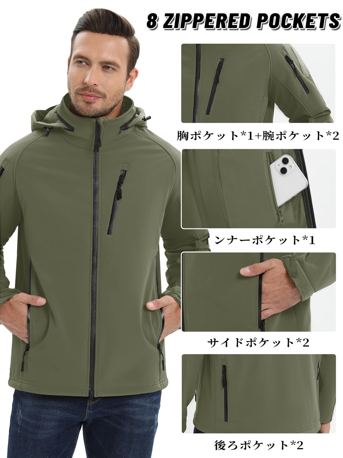KEFITEVD アウトドア ジャケット メンズ 裏起毛 マウンテンパーカー 防寒 防風 ウインドブレーカー 撥水 ソフトシェルジャケット タクティカル バイク アウター フード付き 無地