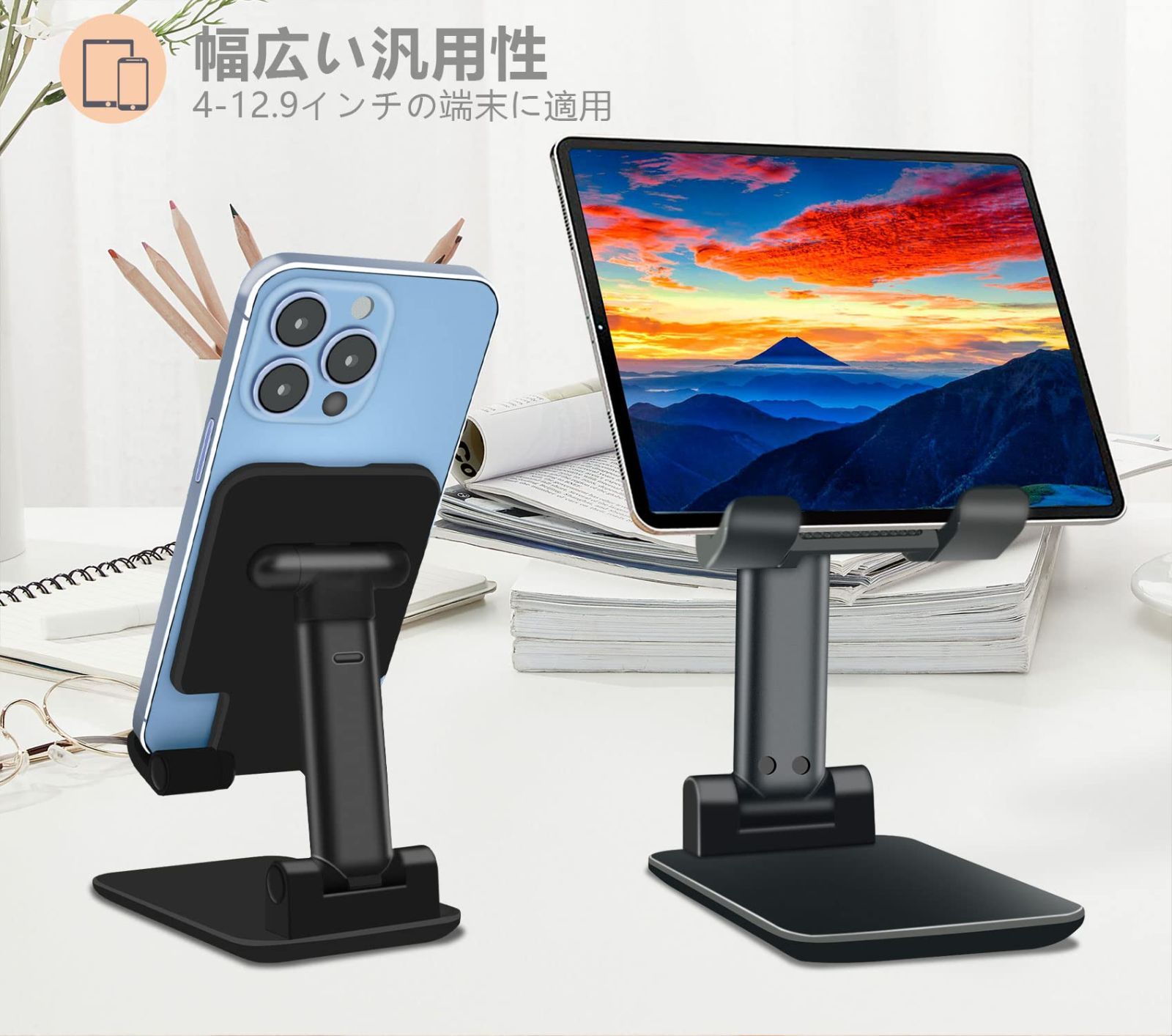 スタンド For 携帯 滑り止め おりたたみ スマホ iPhone ipad Switch Samsung Sony Nexus Kindle Android ブラック セット 高度調整 ホルダー 卓上 スマホスタンド