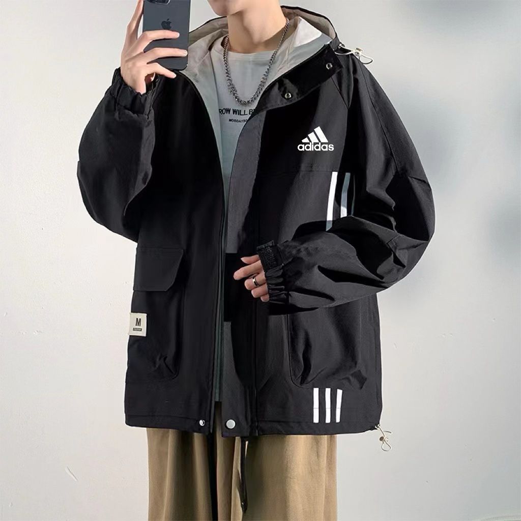 アディダス Adidas 春と秋の新モデルのレジャージャケット 男性用 どんなものにもマッチする通気性のあるアウタージャケット アメリカンスタイルのフード付きで 感あふれる レラックスフィットのライダージャケット -MM輸入1