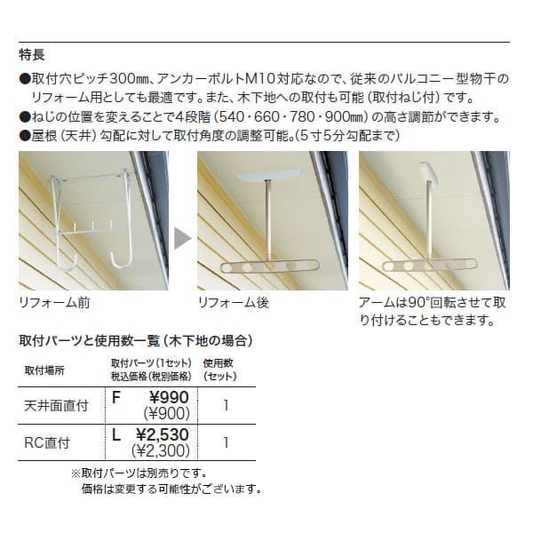 取付穴ピッチ300mm、アンカーボルトM10対応なので、従来のバルコニー型物干のリフォーム用としても最適です。また、木下地への取付も可能(取付ねじ付)です。