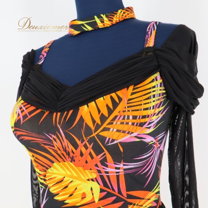 社交ダンス 衣装 ドレス ワンピース パーティ 発表会 黒 フリル レース 柄 模様 ブラック系 オレンジ系 伸縮素材 薄い素材 ふんわり広がる Mサイズ レオタード 競技用 ドレスアップ おしゃれ レディース イベント