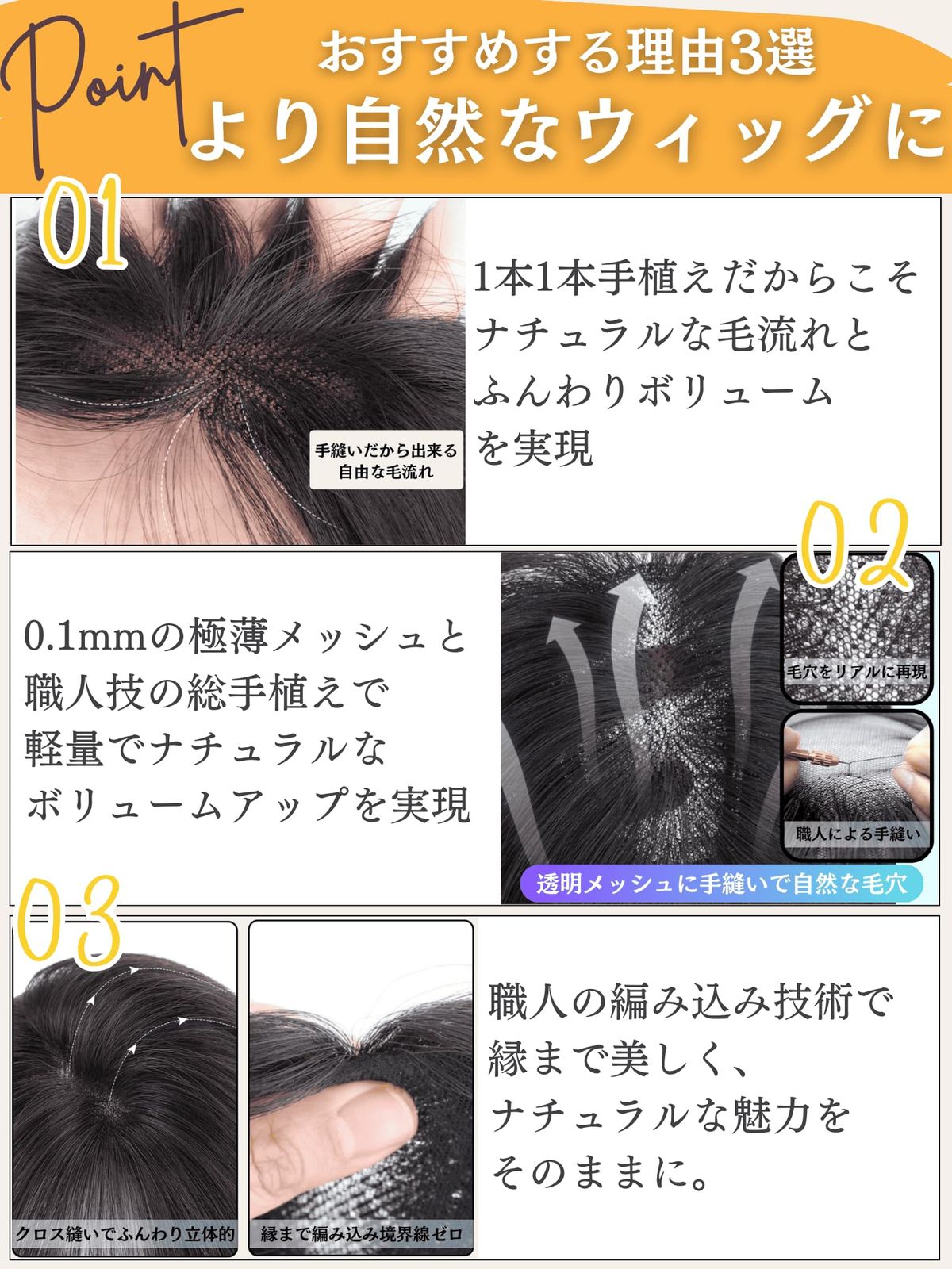 ハゲ隠し✅【透明メッシュで馴染む自然な仕上がり】8肌に溶け込むような透明メッシュ素材を使用。どの角度から見ても地肌が透けて見えるため、まるで自分の髪のように自然な印象を演出します✅【細部までこだわった美しさ】9熟練の職人がひとつひとつ手縫いで植毛し、毛穴の質感まで細かく表現。人工的な不自然さがなく、まるで地毛が生えているかのような仕上がりに。