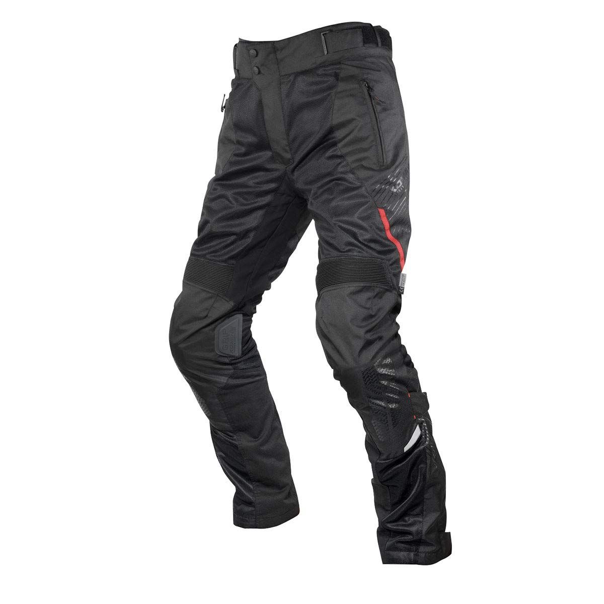 膝はもちろん大腿部や尾骨部にもプロテクターを装備しながらも軽さを感じる仕上がりが特徴のフルアーマーメッシュパンツ。エンジン熱対策のため膝下の内側は耐熱生地を使用。膝の内側部分にはニーグリップアシストパッチを装着。