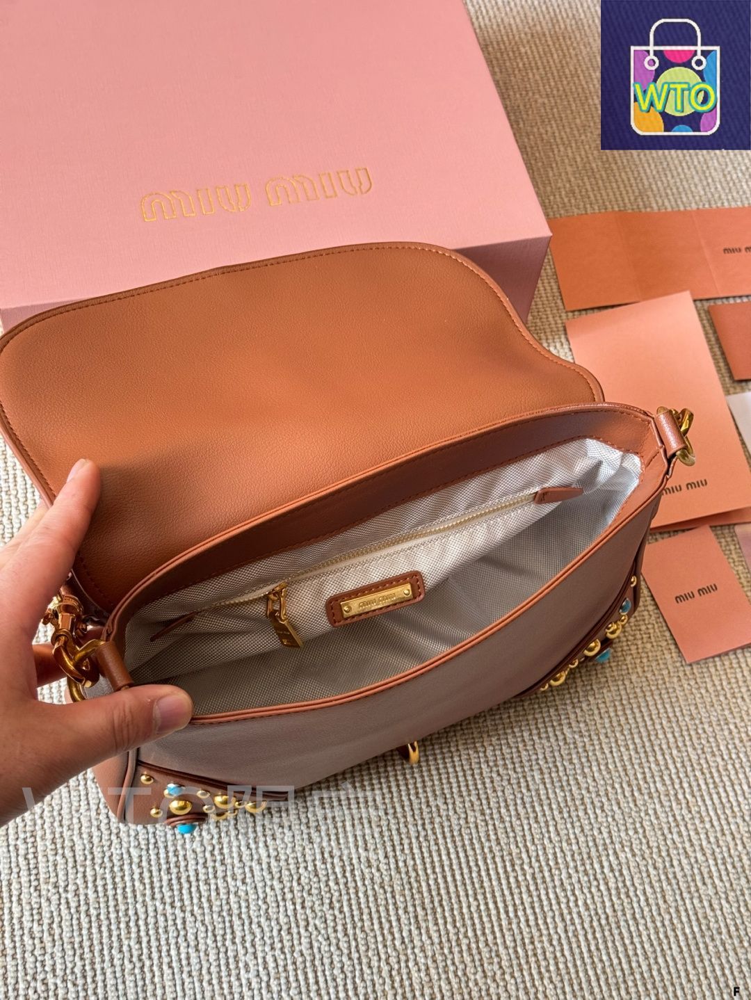 民族風 × ミュウミュウ:幾何学模様やトラディショナルな刺繍、ターコイズの宝石調フィニッシュが融合し、エレガンスとボヘミアンな雰囲気を同時に演出。通常のミュウミュウバッグとは一線を画す個性的な世界観を展開します。
