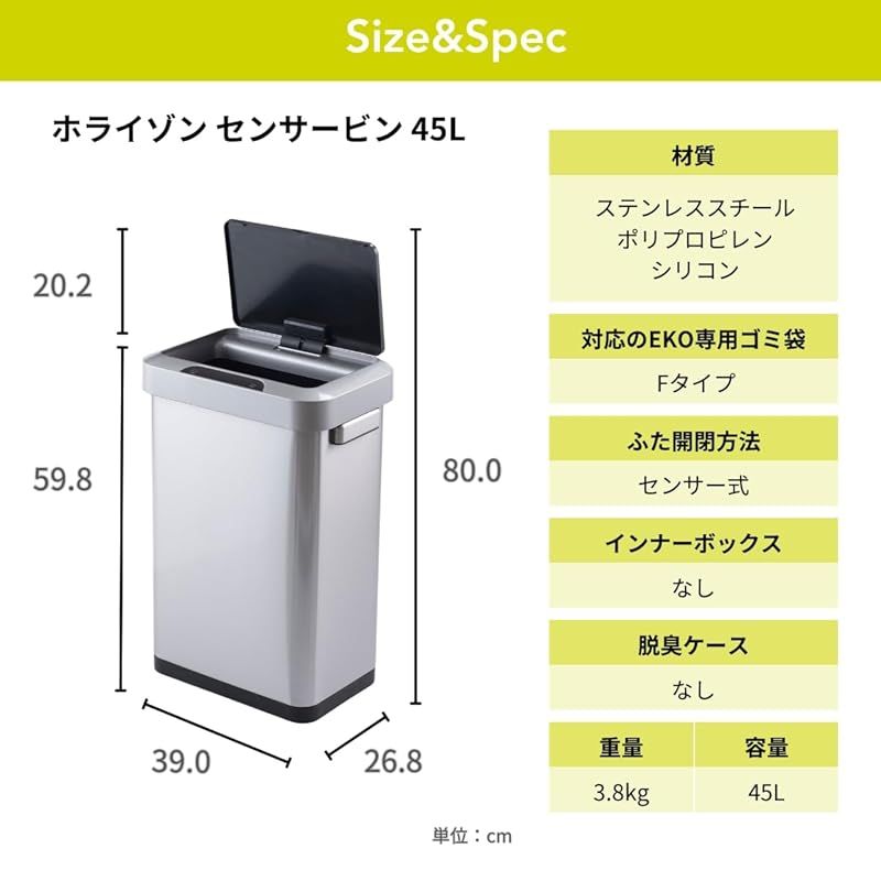 商品名:EKO ゴミ箱 自動開閉 ホライゾンセンサービン ホワイト 45L ふた付き インナーボックス無し EK9262P-45L-WH