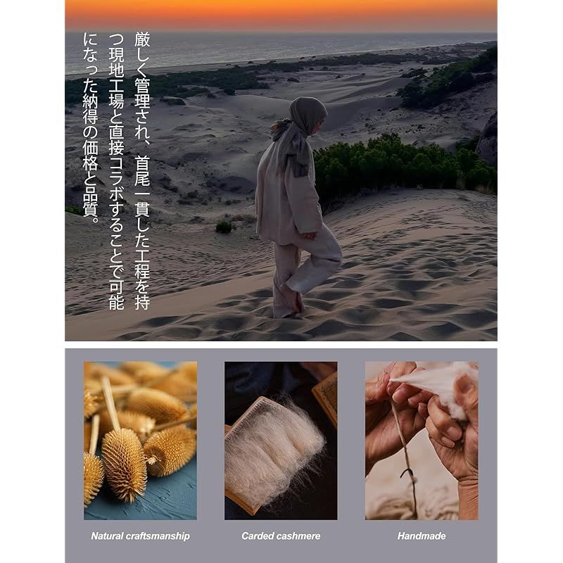 素材:内モンゴル産 カシミア100%。アルバス地方から採取される高級カシミヤを使用。薄いのに暖かい、気品のあふれる落ち着いた光沢と肌触りが特徴。サイズ:縦180cm × 横30cm (8cm×2フリンジ含む)重量約125g。大きすぎず小さすぎない程よいサイズ感。肩から掛けてストール代わりに、折りたたんでひざ掛け代わりにも。