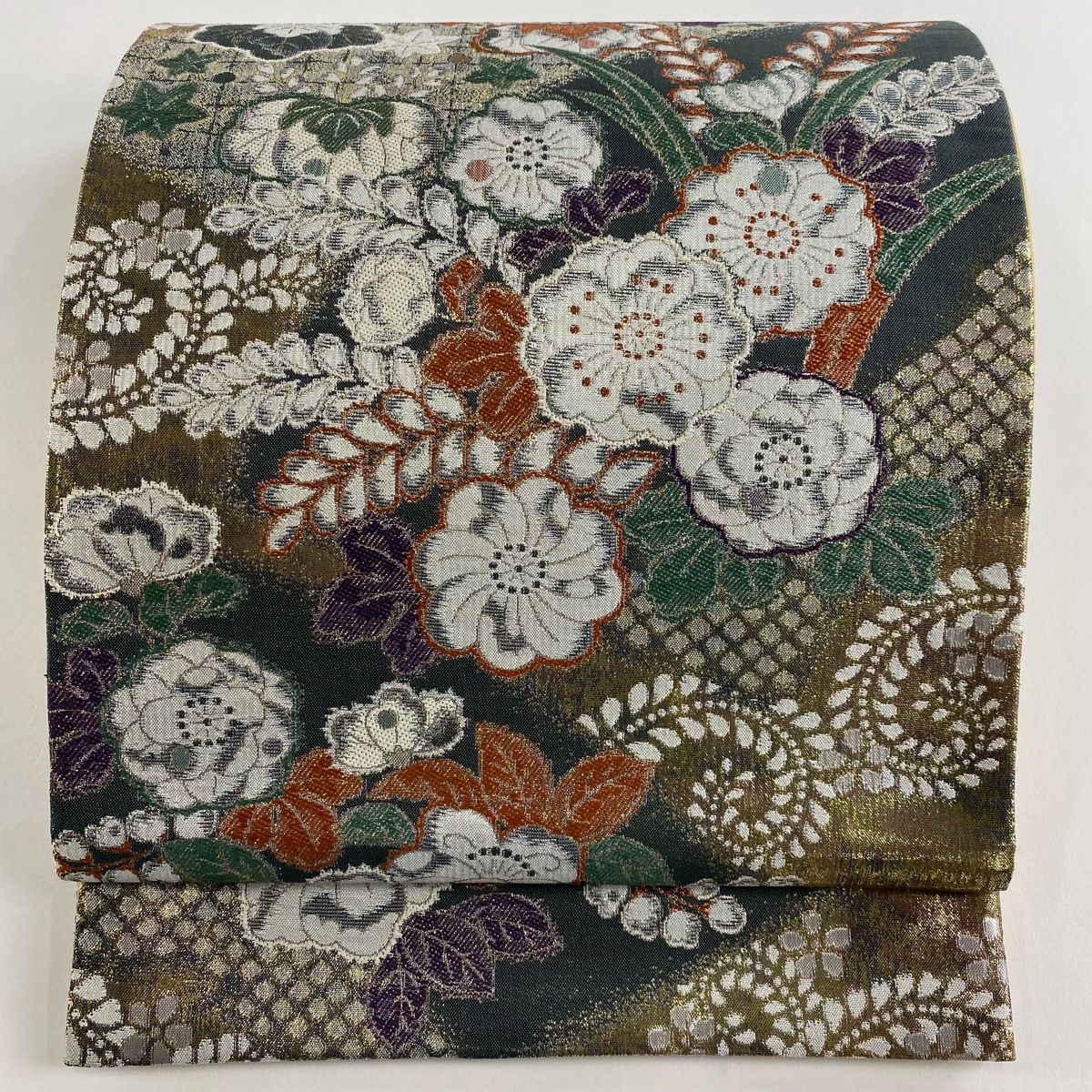 袋帯 秀品 草花 唐草 箔 灰緑 六通 正絹