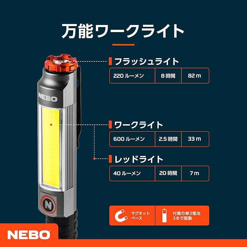 ●多機能な3-in-1懐中電灯(先端)と作業灯(側面)で7つのライトモード●底面マグネット付きです。●ポケットやベルトに取り付けて、頑丈なクリップで持ち運びできます。●単3電池3本で駆動します