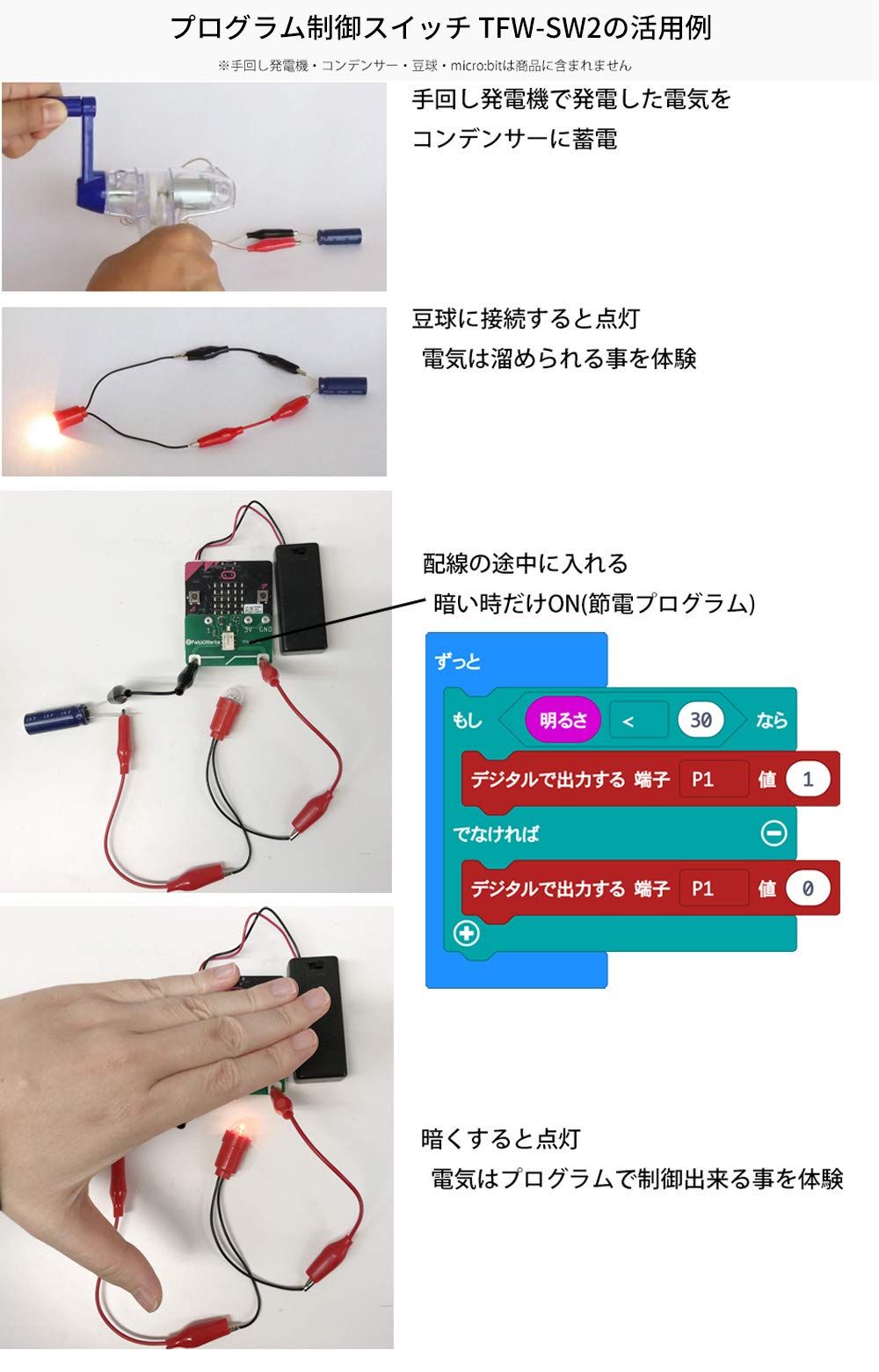 小学校6年生の理科の「電気の利用」において、手回し発電機でコンデンサーに蓄電した電気をダイレクトにプログラムで制御するのに最適です。