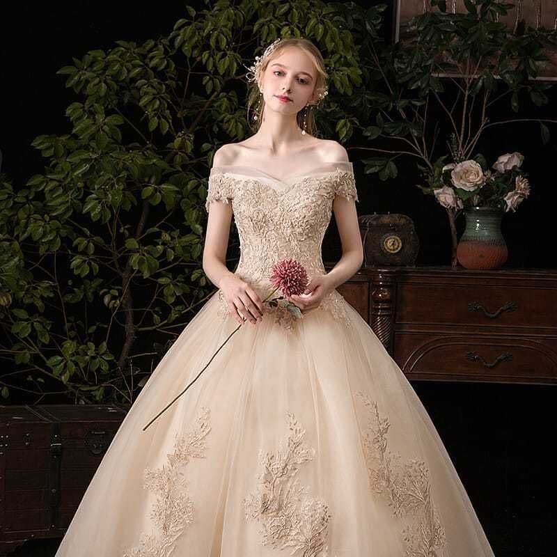 ️シャンパンゴールドに咲く花刺繍が美しいクラシカルプリンセスドレス