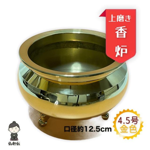 香炉灰付き 4 5号 上磨き 机上香炉 口径12 5 cm 真鍮色 金色 仏壇 仏具 お盆 彼岸 法事 ゴールド 線香立て 香呂 各宗派 高岡仏具 国産品