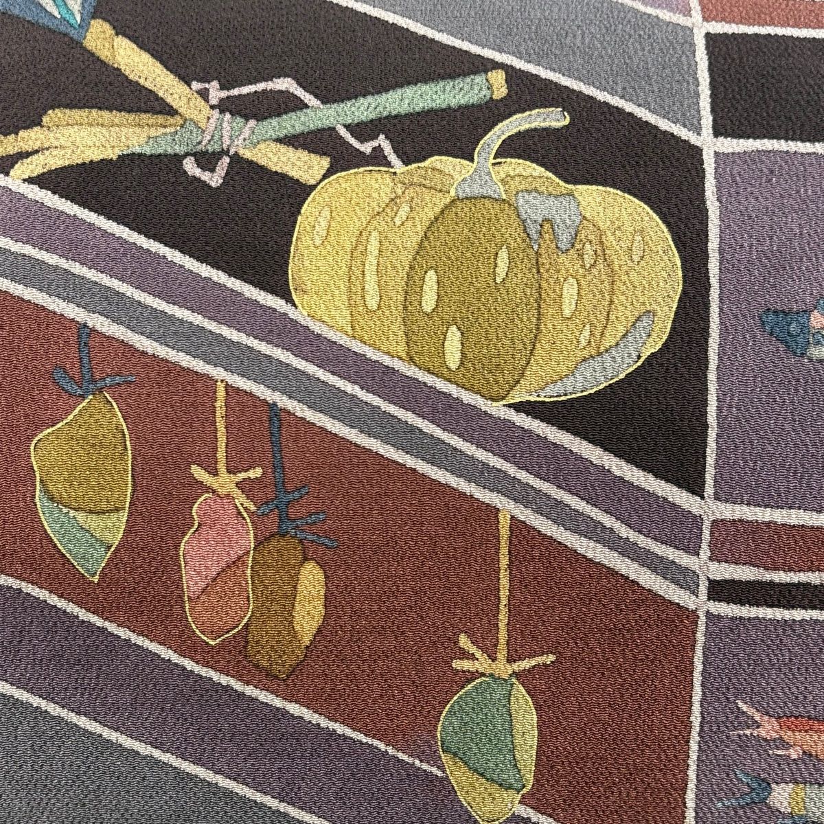 名古屋帯 秀品 生り物 魚 金彩 縮緬 紫 正絹
