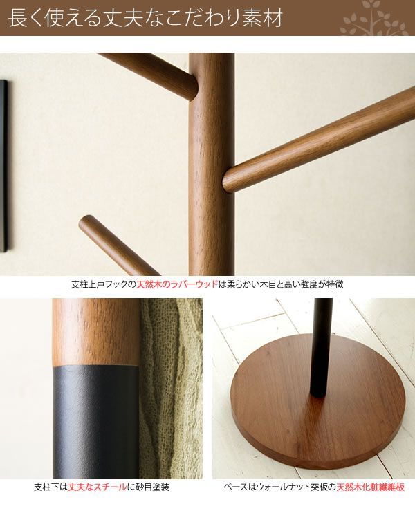木の枝のように支柱から伸びたフックは、ハンガーを使ってコートを掛けたり、直接帽子やバッグを掛けたりと使い道色々。ご家族でお使いいただけます。