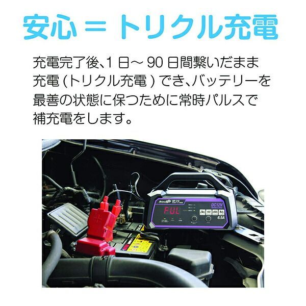 ・充電完了後も長期つなぎっぱなしや自然放電も自動検知し最善の充電を行い過充電の心配なしのトリクルパルス充電です。