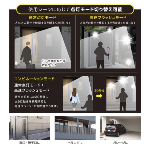 ・コンビネーションモード(通常点灯モード+高速フラッシュモード)…通常点灯をした30秒後にさらに動きを検知すると、高速フラッシュに切り替わります