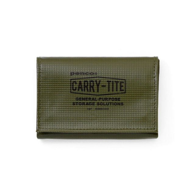 テントやトラックの幌などに使われる丈夫な素材であるターポリンを使用したキャリータイトケース。三つ折りして小銭入れやカードケースになり、二つ折りでやや小ぶりなポーチとしてもお使いいただけます。【検索ハッシュタグ】#ハイタイド#カードケース#カード入れ#キャリータイトケース#ペンコ#カーキ