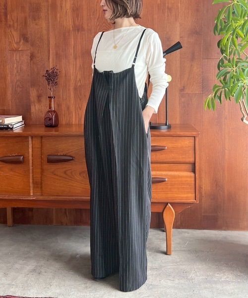 フェイクレザーの華奢なサスペンダーが、モードな雰囲気を引き立てます。