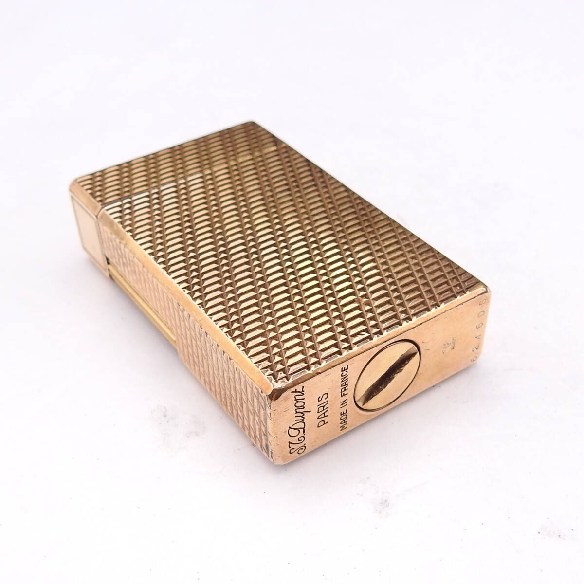 S.T Dupont(エス・テー・デュポン)の名品「ライン1」シリーズより、ロングサイズのガスライター✨ 高級感あふれるゴールドカラーと、手に馴染む重厚なフォルムが魅力の逸品です? サイズは約58×34.8×14mm、シリアルナンバー「6245DS」刻印あり。 撮影時に着火確認済みですが、ガス漏れの有無は不明のため現状渡しとなります。 小さなスレ傷はありますが、全体的に美品コンディション。鑑定済み正規品なので、安心してご購入いただけます?️