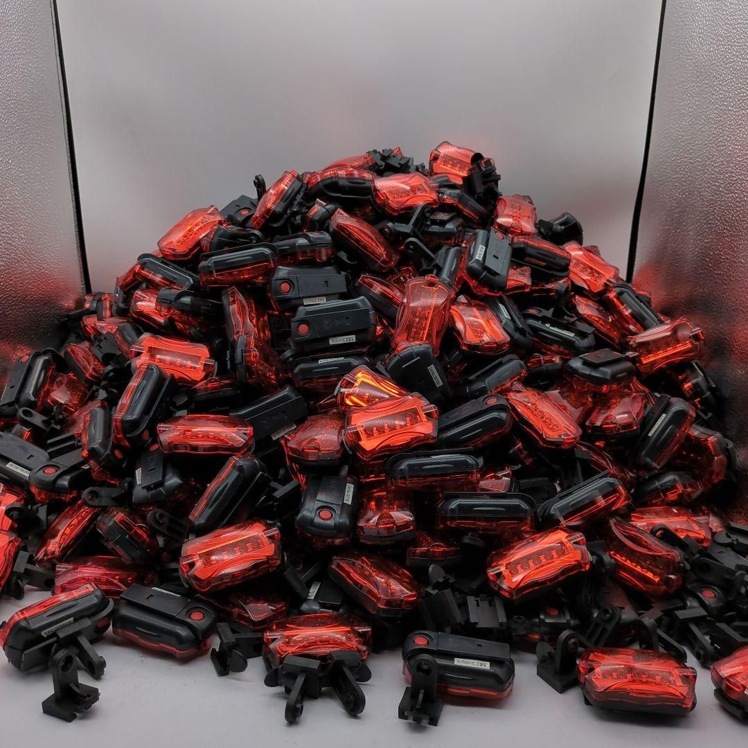 自転車用の赤色ライト、サイズ約4cm x 2cm、数量多数。少なくみて250以上かと