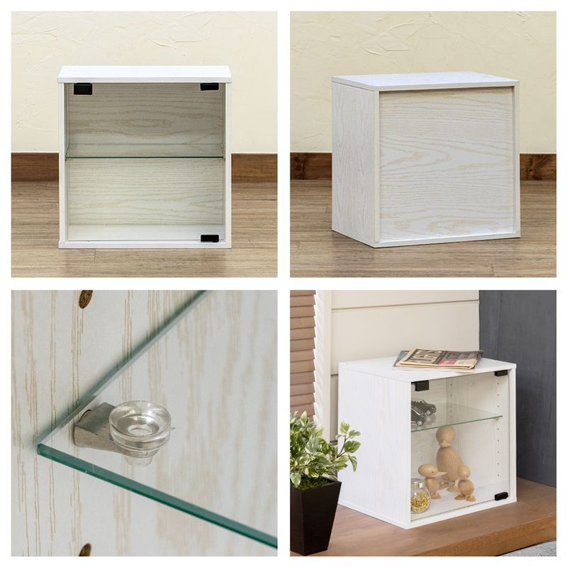 ガラス扉で中身が見えるキューブ型コレクション収納ケースです