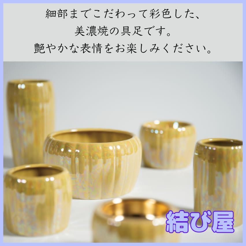ミニ仏壇にちょうど良い小さいサイズの五具足です。花立(仏壇用の花瓶)、灯立(ろうそく立て)、香炉(お香立て)、茶湯器、仏器(仏飯器)の5点がセットになっています。上品な質感が特徴の、美濃焼の仏具です。